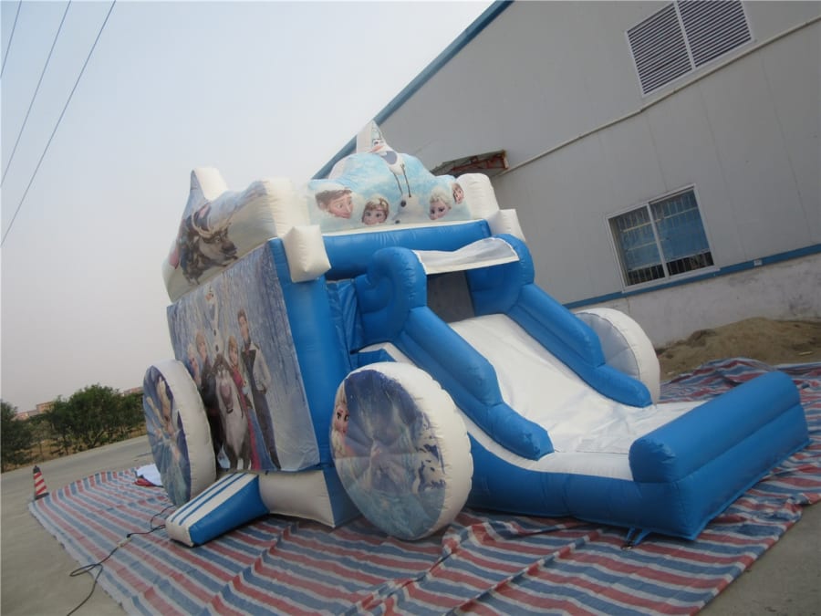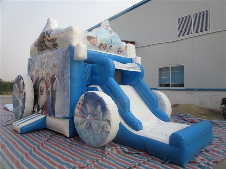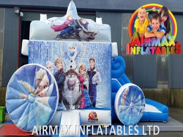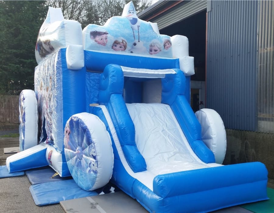 Displaying all the Frozen characters on the outside, this fully covered bounce & slide carriage is guaranteed to make every girl dreams come through. With a generous, fully covered bounce area, the Frozen Carriage also has a slide coming out at one end to give everyone the best of both worlds. You will have to be quick to book though because this is sure to become one of our most popular inflatables. So hurry now and get booking the Inflatable Frozen Bounce & Slide Carriage today. Size: 6M L x 4M W x 4M H