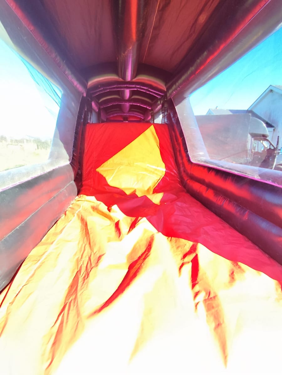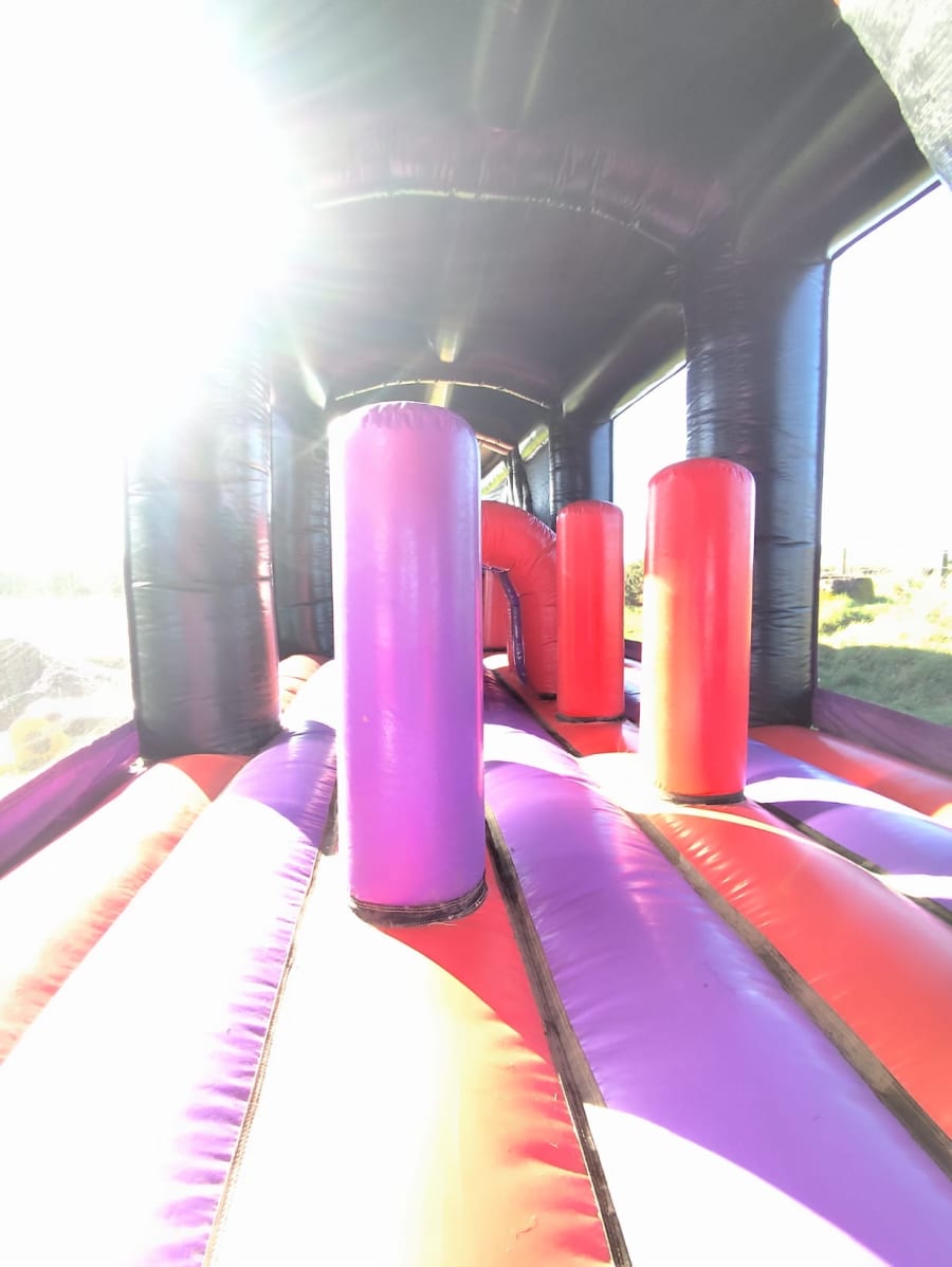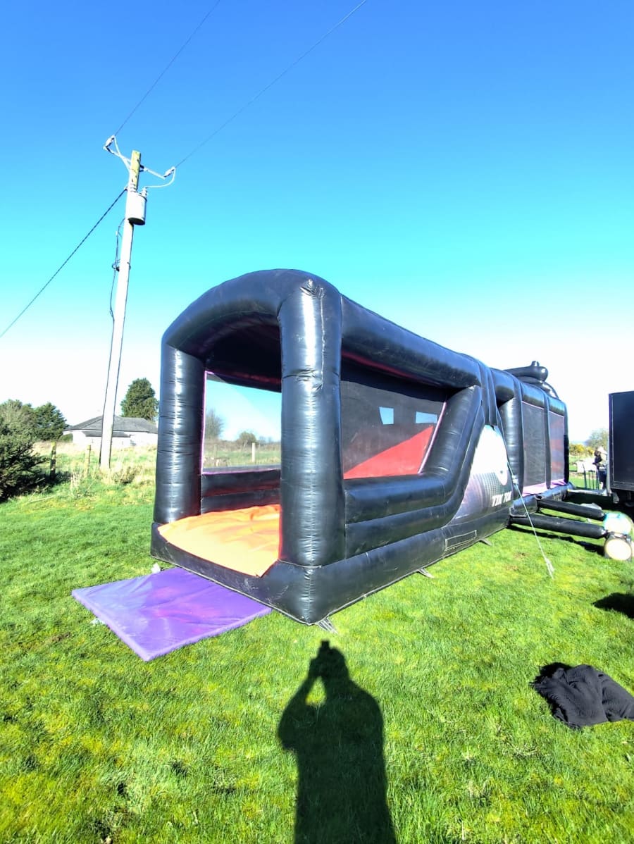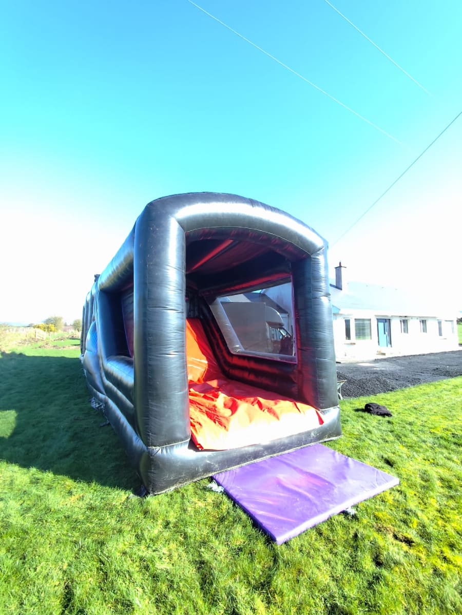 With space in the roof for disco light and at the front for a bluetooth speaker. Dark interior to reflect the disco light when it is dark outside to really see the full effect. The kids will be entertained for hours with a huge long bounce area, inflatable tunnel, biff bash punching bags, and also to the front we have a huge slide with a climbing wall to help you to the top.