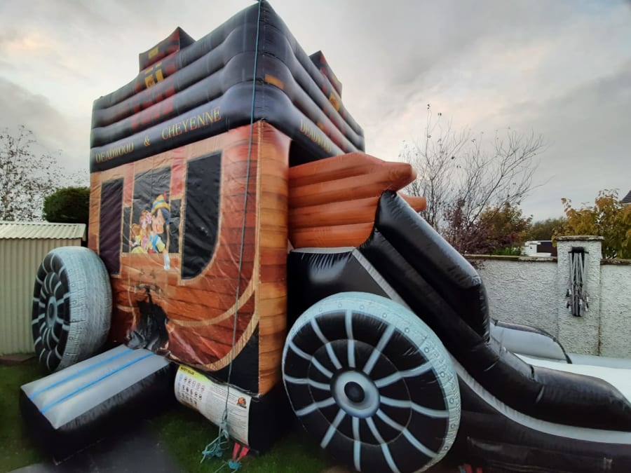 Boldly enter the Wild West in this incredibly detailed bouncer/slide combo, the all New Inflatable Stagecoach. Beautiful artwork and real life design makes this inflatable great for Western themed parties and events. Rent the Stagecoach Combo for your next Cowboy party or Western themed party and go on a ride you will never forget. Can be used as an advertising Inflatable also, and we can theme this with your company logo. Planning a Wild West Themed part, this unit is Ideal. Packages now available for Wild West Themed Nights. Suitable for Adults and for Kids. Size: 14'W x 31'L x 16'H