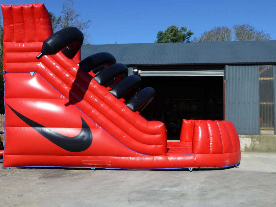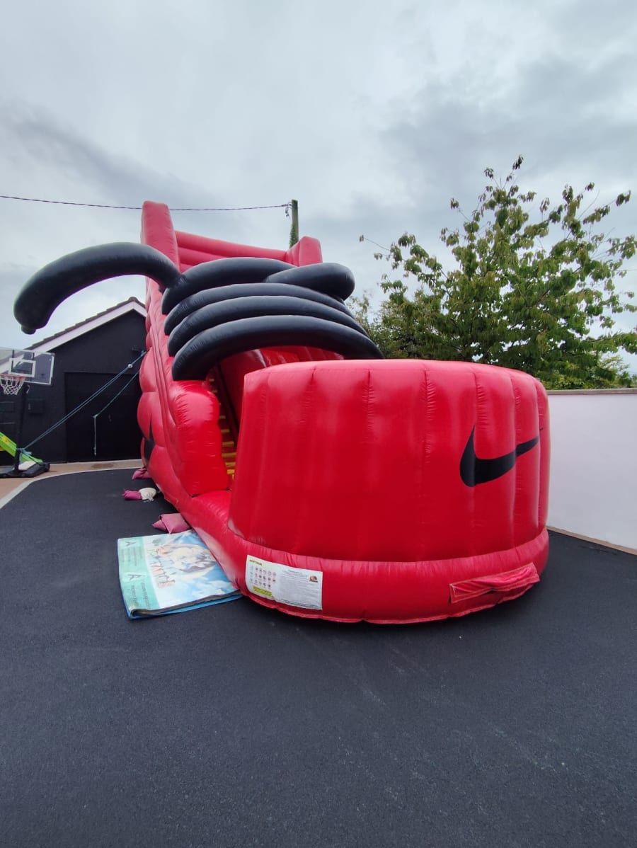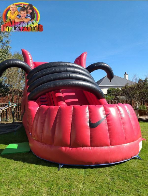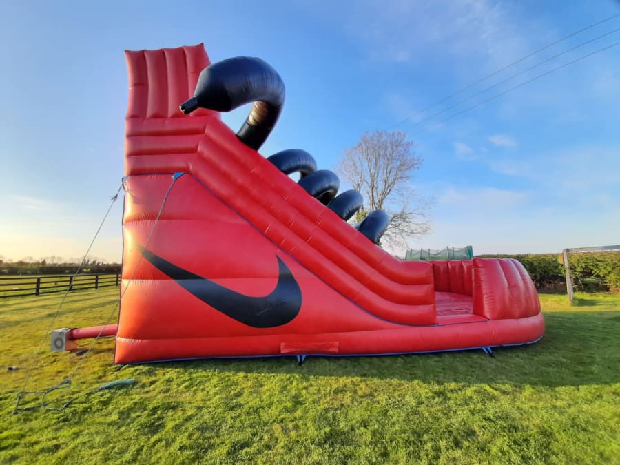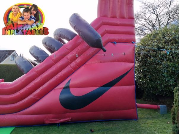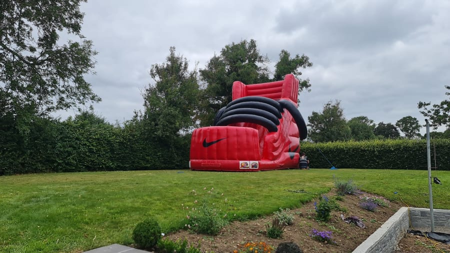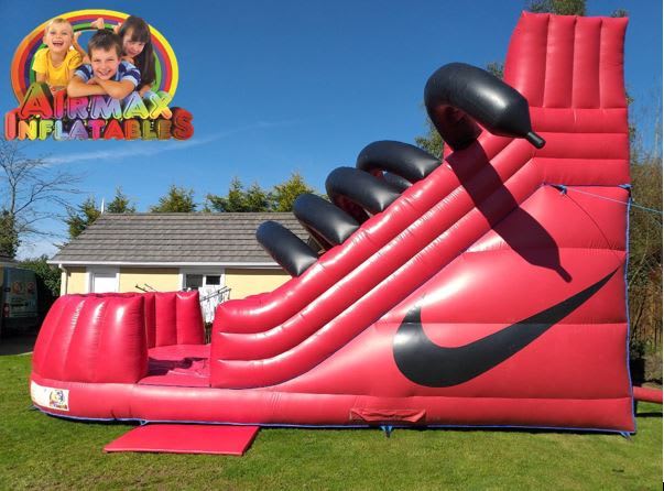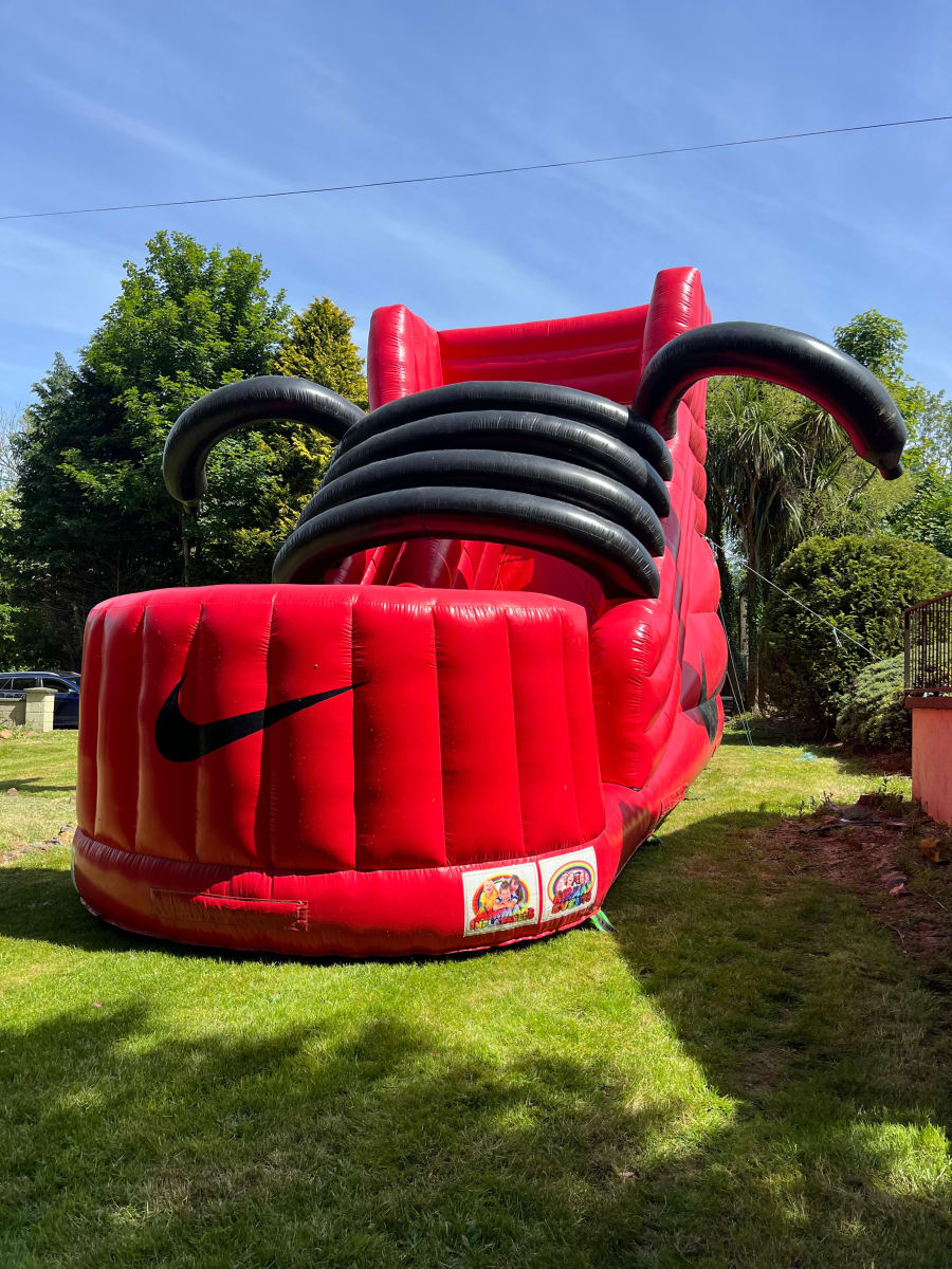 We all have worn Nike Runners, and now you can hire our exclusive Nike Runner Slide. Measuring in at over 20ft in height, slide down on our high gloss slip sheet underneath the black laces to the toe area, where you find a generous bounce area. This is one of our bestsellers and is suitable for corporate events, sports days, family fun days, field days, shows, festivals and of course birthdays, communions and confirmations.