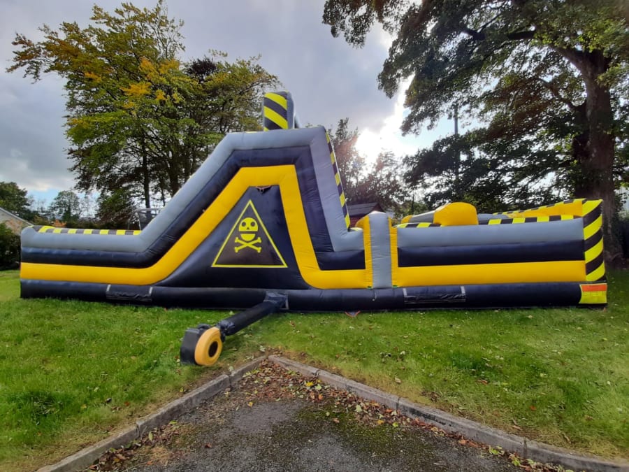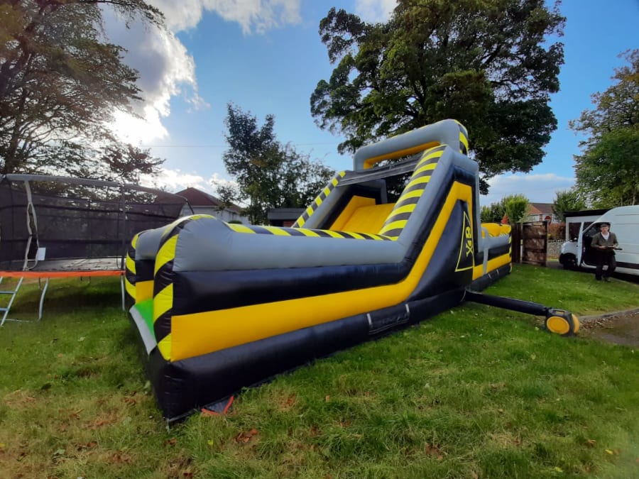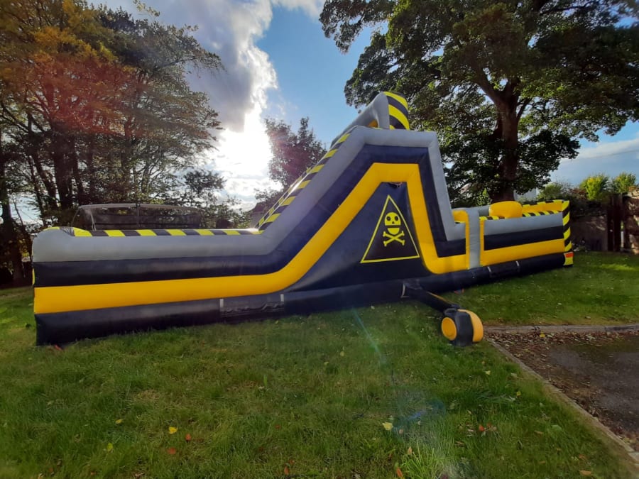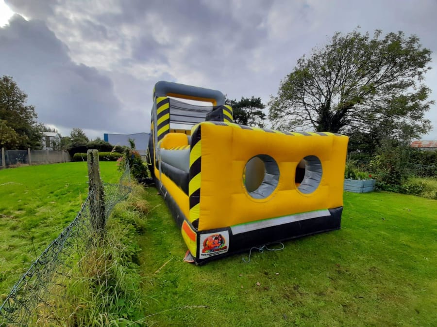 Yet another spectacular obstacle course over 42ft in length that is jam-packed with two tunnels that you squeeze through at the start. Then there are upstanding batons that you must manoeuvre through, and the obstacle course finishes with a generous climbing wall and a slide. This unit is ideal for all age groups and extremely entertaining and fun.