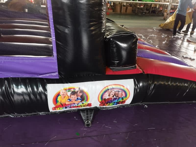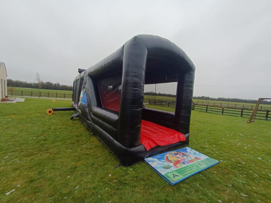With space in the roof for disco light and at the front for a bluetooth speaker. Dark interior to reflect the disco light when it is dark outside to really see the full effect. The kids will be entertained for hours with a huge long bounce area, inflatable tunnel, biff bash punching bags, and also to the front we have a huge slide with a climbing wall to help you to the top.